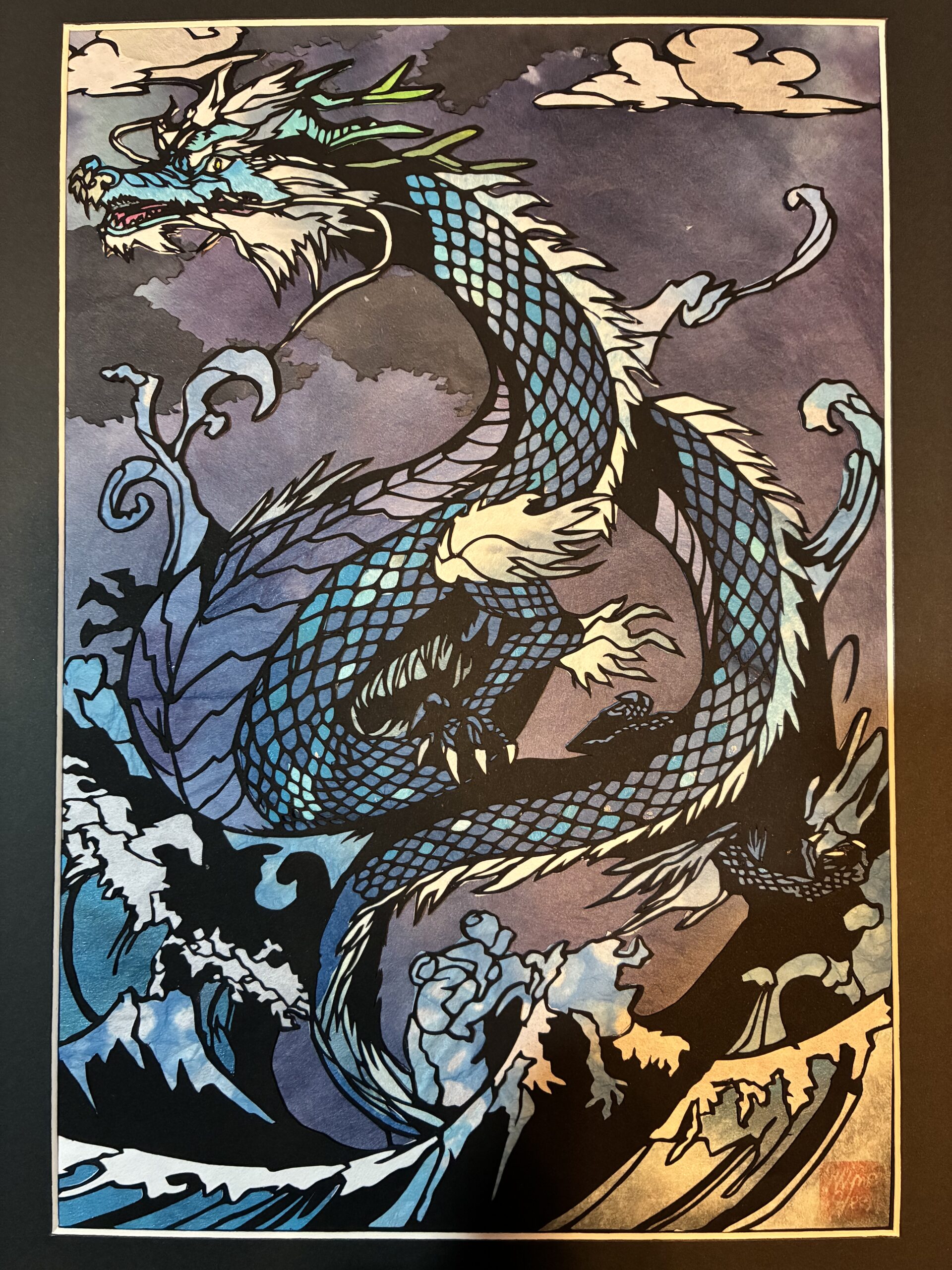”川や海の神から連想される「水龍」をイメージして下絵から制作しました。天災が多い近年ですが、できるかぎり穏やかな気候、地勢を願い、この作品に想いを込めました”
