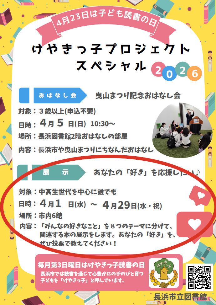 長浜市では、読書を通じて心豊かにのびのびと育つ子どもを市の木にちなみ「けやきっ子」とし、毎月第3日曜日を「けやきっ子読書の日」、4月23日から5月12日は「こども読書週間」と定めています。