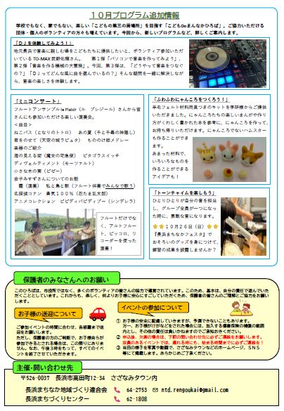 「こどもDoまんなかひろば」 第2土曜日、午前10時から午後3時まで、さざなみタウンで。 (原則小学生対象) 申込は10月2日(水)17時から→https://logoform.jp/form/BJcW/1241113 […]